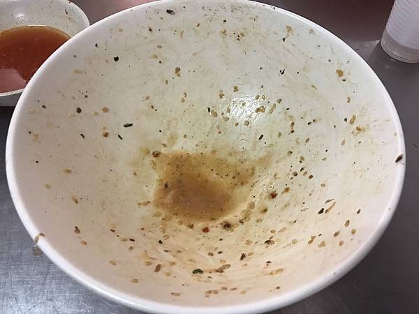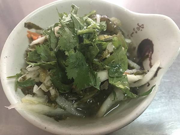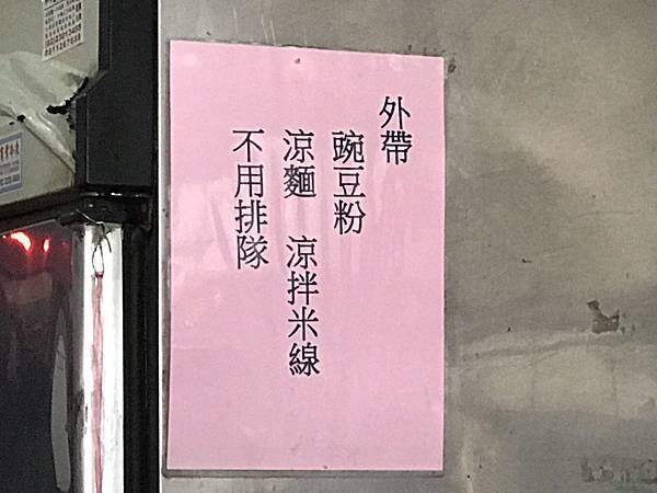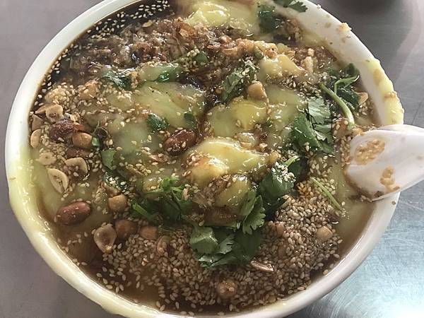 通常都是外帶叉燒乾麵,但今天內用外面不常見的稀豆粉($60),稀豆粉就是還沒凝固的豌豆粉,可以加粑粑絲也可以吃純的稀豆粉,稀豆粉上面有加甜醬油、白芝麻、花生、油蔥酥、香菜,老闆還會問要不要加點疙瘩(豌豆粉塊),另附酸菜乙碗。